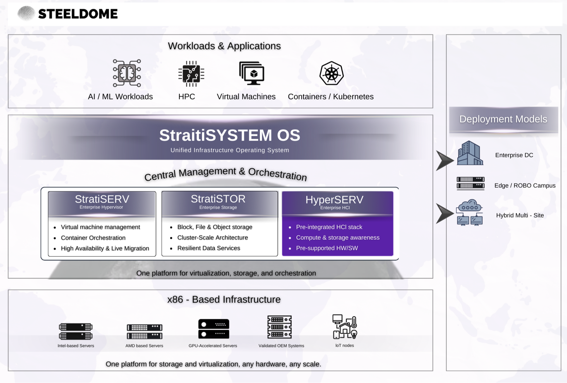 Supermicro’s leadership in energy-efficient, highly configurable x86-based systems using Intel® and AMD® processors complements SteelDome’s software-driven approach. Together, they deliver an enterprise platform that supports modern workloads without the cost, rigidity, or complexity of legacy infrastructure models.